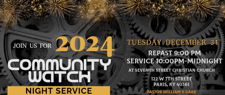 We will be hosting a Community New Years Eve Watch Service on December 31st. The evening will begin with a repast at 9:00 PM followed by the watch service at 10:00 PM.